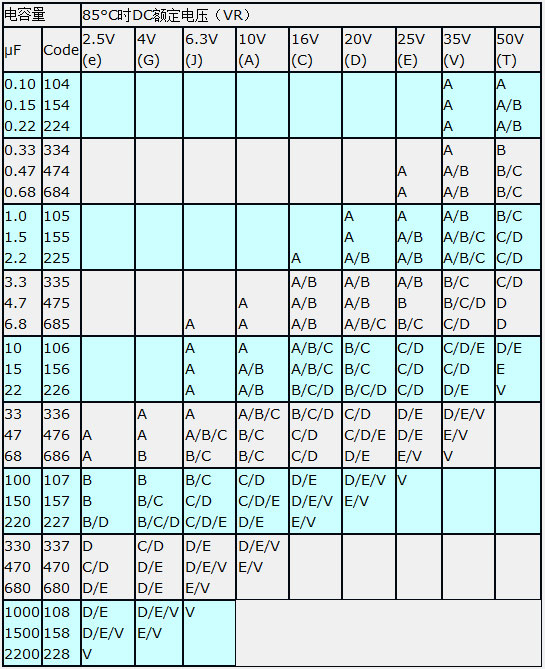 AVX 常規(guī)系列(TAJ)貼片鉭電容:容量和額定電壓(字母表示封裝大小)