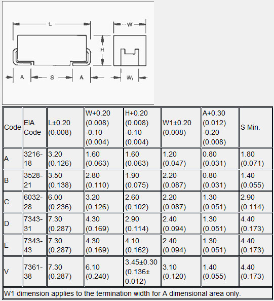 貼片鉭電容封裝、尺寸 封裝尺寸:毫米(英寸)