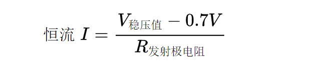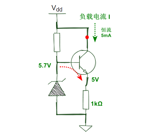 用穩(wěn)壓管穩(wěn)定三極管基電壓,此電壓經(jīng)過發(fā)射結(jié)鉗位之后降低0.7V,此時發(fā)射極電壓也是穩(wěn)定的,發(fā)射極電壓除以發(fā)射極電阻就得到恒定電流。如圖,在紅點處接負載,負載電流恒定為5mA。