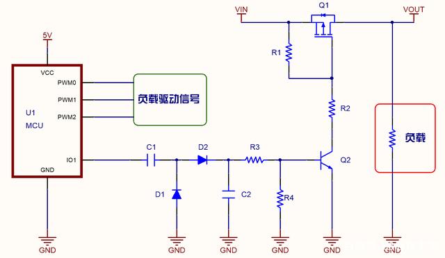 本電路重點(diǎn)運(yùn)用了電容的隔直流特性,既能讓連續(xù)變化的PWM耦合通過,又可以阻止直流電壓通過,從而有效檢測(cè)MCU是否異常,同時(shí)控制負(fù)載供電開關(guān)。
